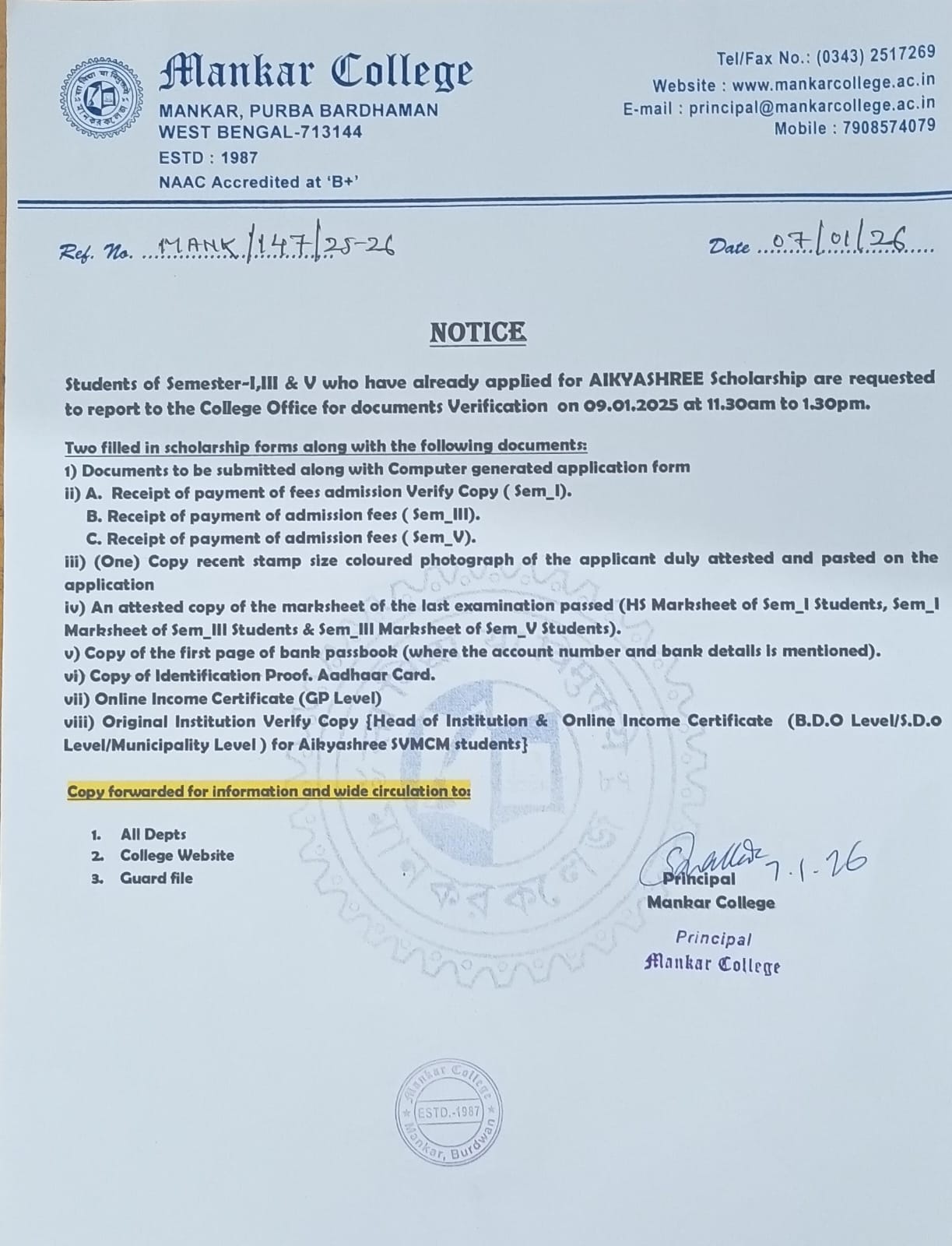 | 2 | 07 Jan 2026 | Notice for Aikyashree Scholarship form | Download | tr >